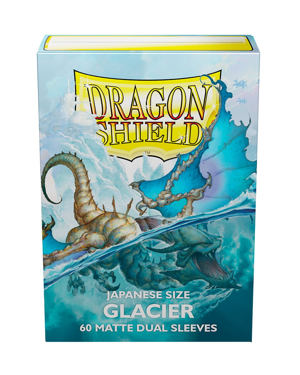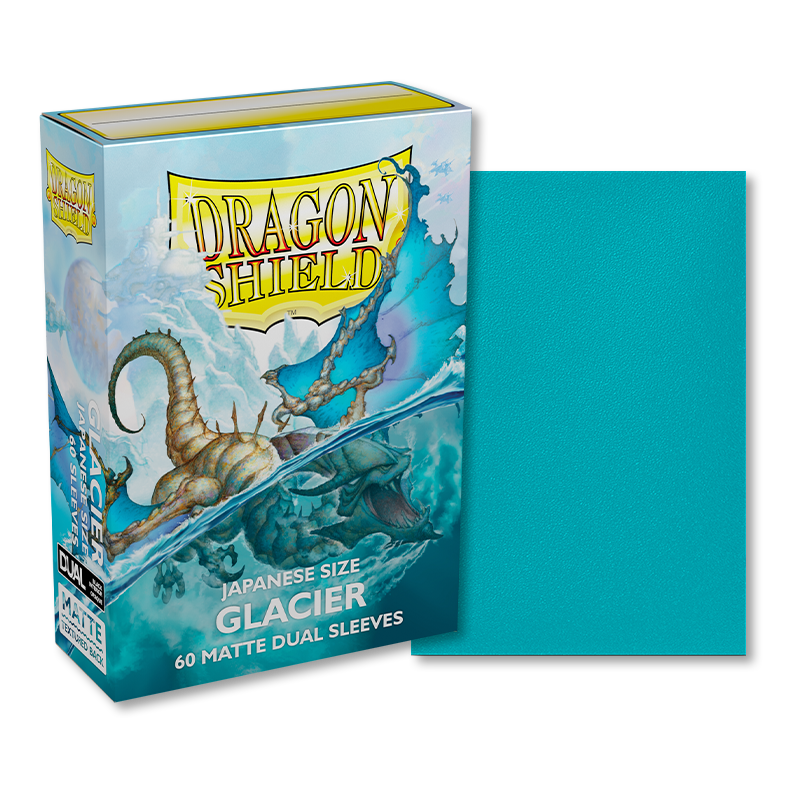 Glacier – potężne i lodowate koszulki Dragon Shield Japanese Dual Matte. Przezroczysty przód i teksturowany, matowy tył w chłodnym odcieniu. W pełni nieprzezroczyste, z czarnym wnętrzem, które tworzy eleganckie tło dla kart z ciemną ramką.