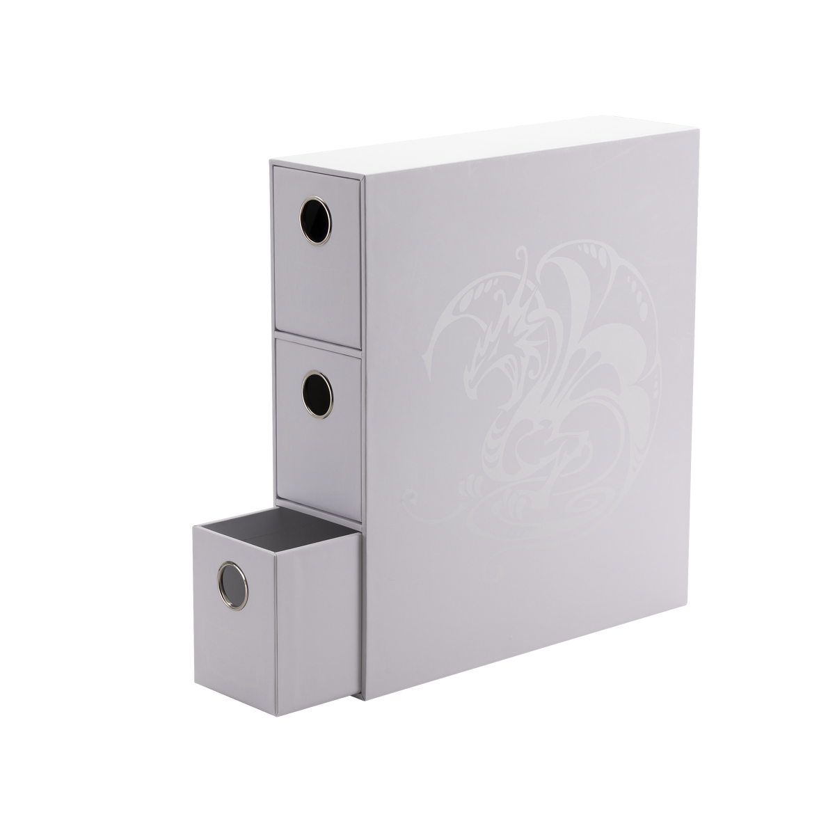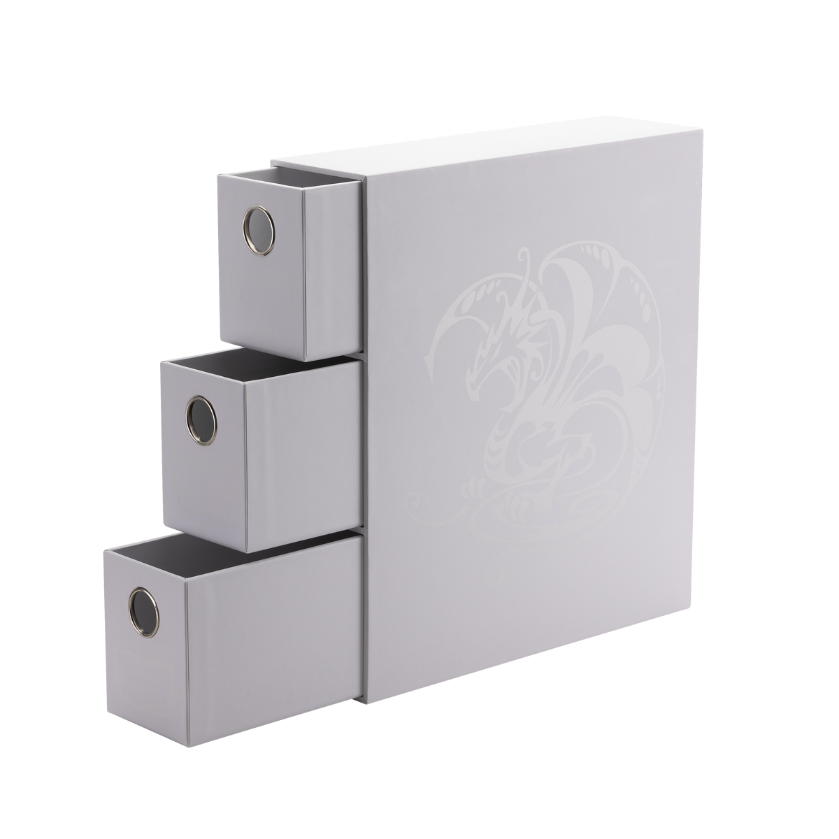 Zestaw zawiera 3 wysuwane szuflady, z których każda mieści ponad 435 kart w pojedynczych koszulkach. Szuflady mogą również pomieścić 5 pudełek Dragon Shield DS100 lub 17 pojemników Cube Shell.